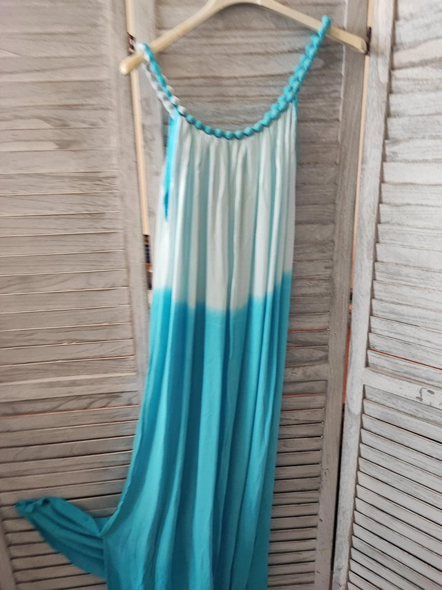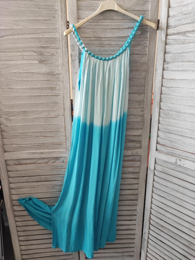 Αέρινο και κομψό, αυτό το μακρύ φόρεμα από 100% βισκόζη αγκαλιάζει το σώμα με ανάλαφρη αίσθηση και φυσική κίνηση. Η ombre απόχρωση του λευκού προς το τιρκουάζ αποπνέει καλοκαιρινή φρεσκάδα, ενώ η πλεξούδα στον λαιμό προσθέτει μια ιδιαίτερη, χειροποίητη πινελιά.